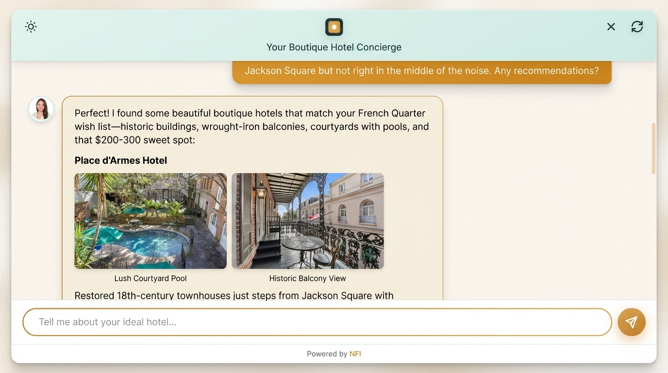 Inndira is an AI concierge that helps travellers discover boutique hotels in New Orleans through natural conversation. Unlike traditional hotel search engines that overwhelm users with hundreds of generic results, Inndira guides travellers through a personalised discovery process, then curates exactly 3 perfect boutique hotel recommendations.